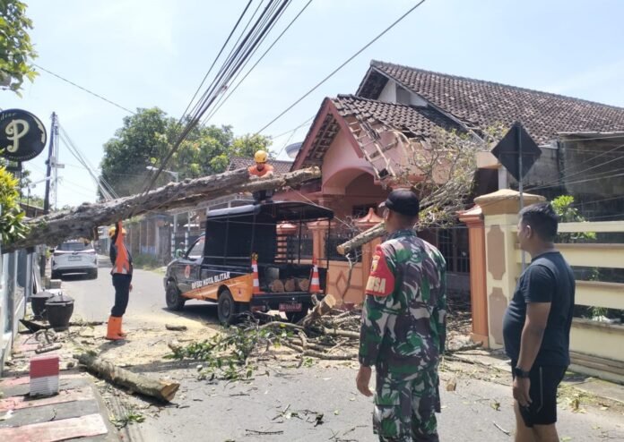 beritanews 9.id || Blitar – Cuaca ekstrem berupa angin kencang menyebabkan sebuah pohon kepel tumbang dan menimpa atap teras rumah warga di Jl. Bunaken RT. 02 RW. 02, Kelurahan Karangtengah Kecamatan Sananwetan Kota Blitar, Sabtu (24/1/2026). Peristiwa tersebut terjadi secara tiba-tiba saat angin bertiup cukup kencang di wilayah setempat.