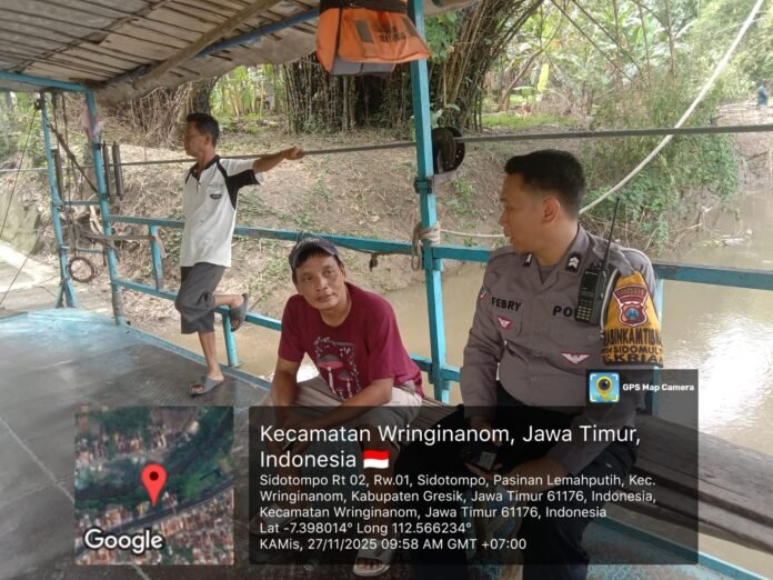 Beritanews9.id || SIDOARJO – Dalam rangka menjaga keamanan dan keselamatan transportasi penyeberangan sungai, Polsek Krian melalui Bhabinkamtibmas Desa Sidomulyo melaksanakan kegiatan himbauan keselamatan pada fasilitas angkutan Sungai Mas berupa perahu tambangan dan Jembatan Gantung Warna Warni di Dusun Patuk, Desa Sidomulyo, Kecamatan Krian, Kabupaten Sidoarjo. Kegiatan ini dilaksanakan pada Kamis, 27 November 2025 mulai pukul 09.00 WIB.