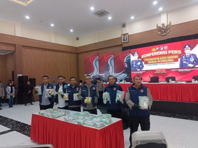 Kapolda Jawa Timur Irjen Pol Drs. Imam Sugianto, M.Si di dampingi Kapolresta Sidoarjo Kombespol Cristian Tobing SH dan dari BNN Sidoarjo Kombespol Gatot Soegeng Soesanto SH mengungkapkan keberhasilan jajarannya dalam menggagalkan peredaran narkoba besar-besaran.Sebanyak 30 kilogram narkotika jenis sabu berhasil diamankan dari jaringan internasional yang beroperasi dari China.