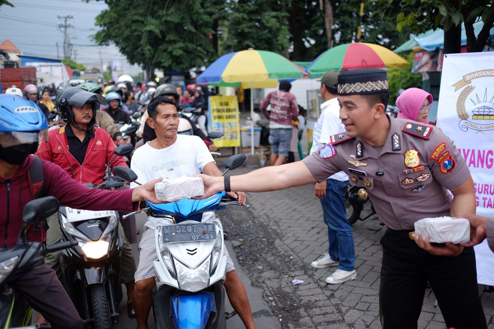 Kegiatan sosial ini dipimpin langsung oleh Kapolsek Taman, Kanisius Franata, yang turun ke jalan bersama para anggota kepolisian dan ibu-ibu Bhayangkari untuk membagikan paket takjil kepada para pengendara motor, mobil, serta masyarakat yang melintas di kawasan tersebut.