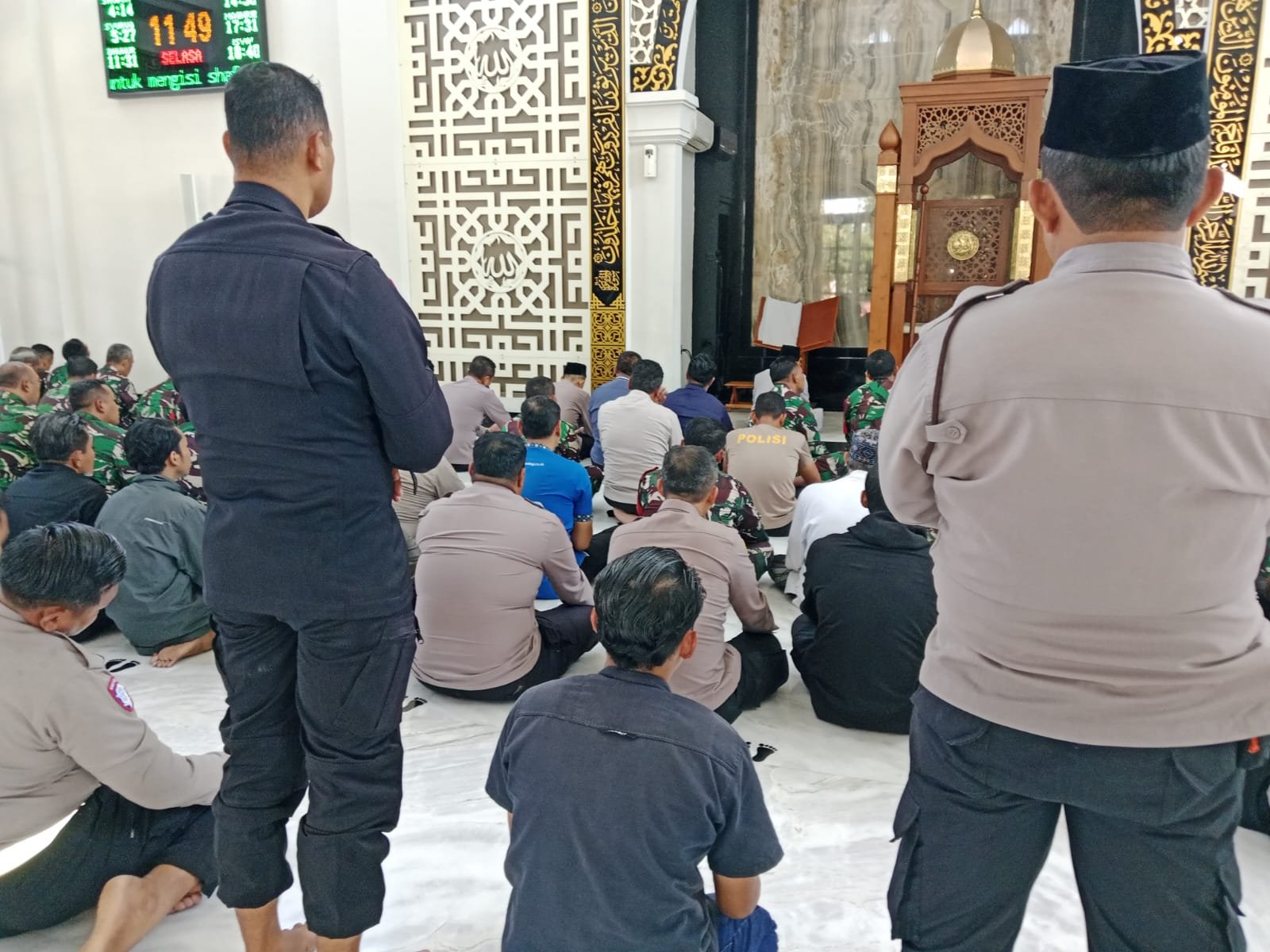 Takmir Masjid Al Ikhlas Mako Polresta Sidoarjo Aminullah mengapresiasi dan salut akan kebersamaan TNI, Polri, mahasiswa dan masyarakat untuk tetap mengikuti shalat berjamaah tepat waktu di tengah situasi seperti sekarang.