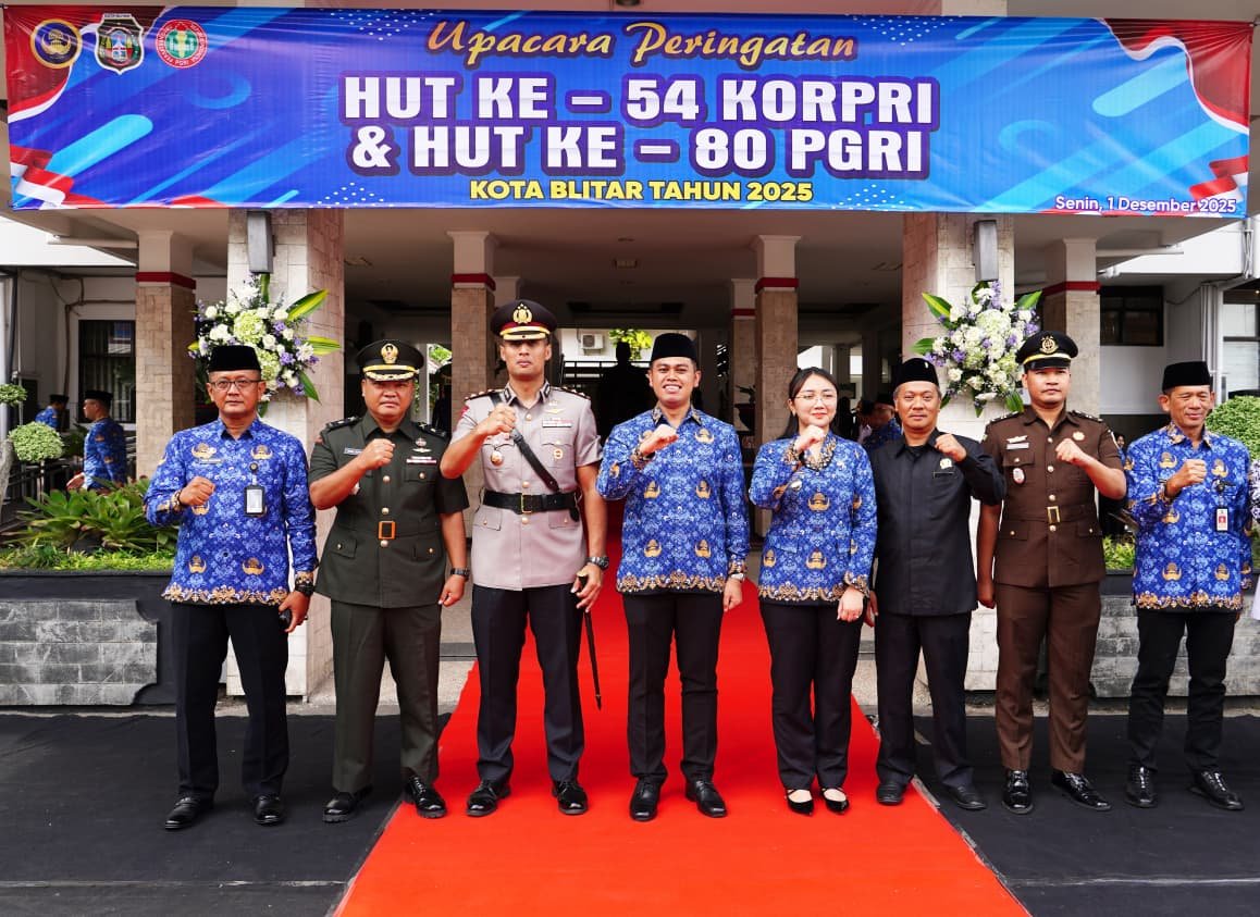 Beritanews 9.id || Blitar – kepala Staf Kodim 0808/Blitar Mayor Inf Imam Suyoso menghadiri Upacara Peringatan HUT Korp Pegawai Republik Indonesia (Korpri) ke- 54 dan HUT PGRI ke 80 Tahun 2025 di Halaman Kantor Walikota Blitar, Senin (01/12/2025).