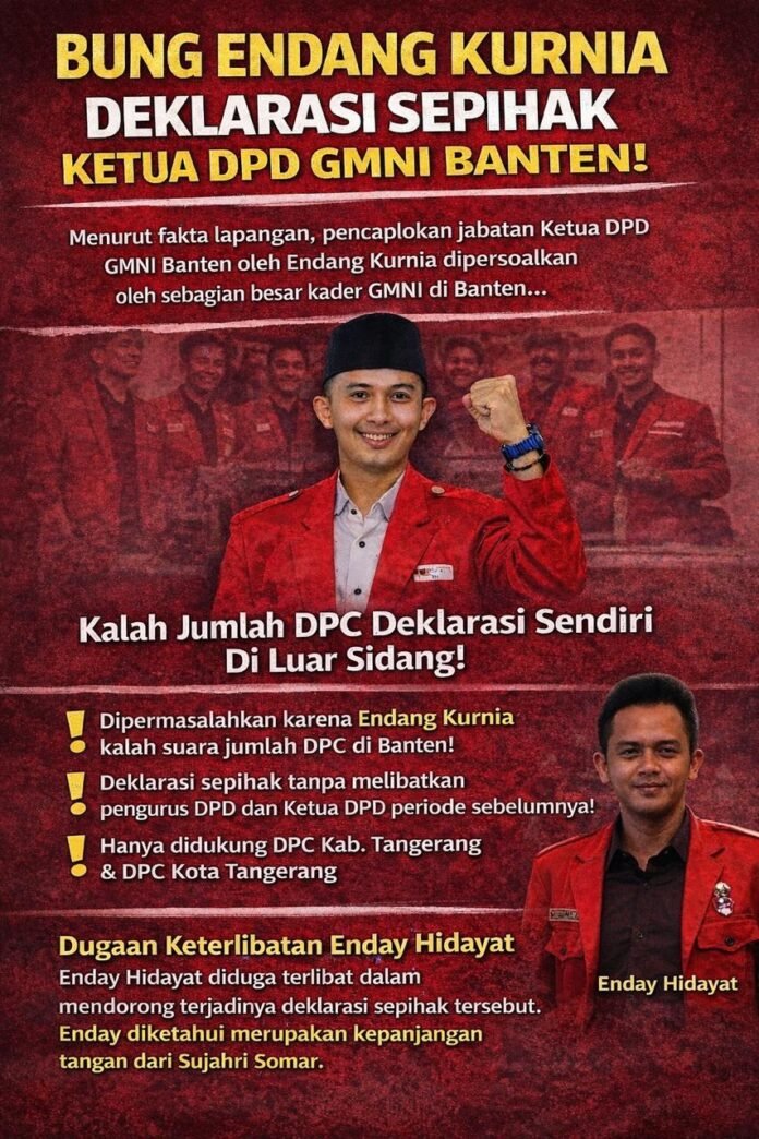 Berdasarkan informasi yang berkembang di internal organisasi, Bung Endang Kurnia tidak memperoleh dukungan mayoritas suara DPC dalam persidangan resmi Konferda VI. Namun demikian, yang bersangkutan justru melakukan deklarasi sepihak tanpa melalui forum persidangan serta tanpa melibatkan Pengurus DPD GMNI Banten maupun Ketua DPD GMNI Banten periode sebelumnya.