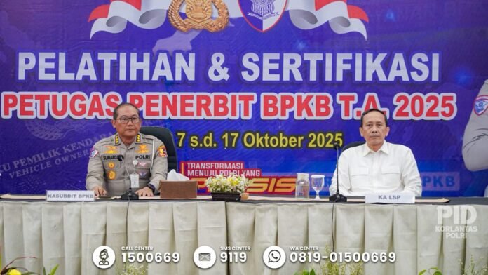 Beritanews9.id || KORLANTAS POLRI, Jakarta — Kegiatan Sertifikasi Petugas Penerbit Buku Pemilik Kendaraan Bermotor (BPKB) Tahun Anggaran 2025 resmi dibuka pada Selasa (14/10/2025) di Cililitan, Jakarta. Pembukaan dilakukan langsung oleh Kasubdit BPKB Ditregident Korlantas Polri, Kombes Pol Sumardji. Kegiatan ini menjadi langkah strategis dalam mendukung transformasi digital layanan kepolisian, termasuk implementasi BPKB elektronik.