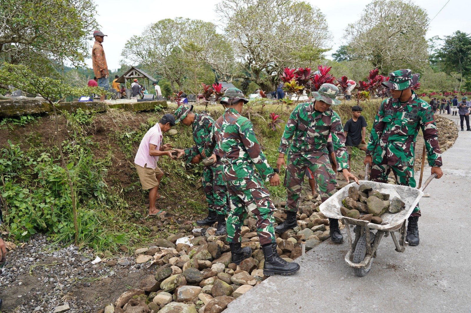 Anggota Satgas TMMD Ke 127 Kodim 0808/Blitar bersama warga melaksanakan gotong royong untuk pemasangan berem jalan sebagai bagian dari tahapan penyempurnaan pembangunan infrastruktur jalan yang menghubungkan dusun krisik dan dusun wonorejo Desa Krisik Kecamatan Gandusari Kabupaten Blitar