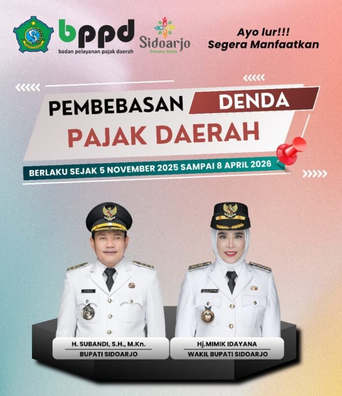 Beritanews9.id || SIDOARJO – Program pembebasan sanksi administratif pajak daerah dilakukan Pemkab Sidoarjo. Program penggratisan denda keterlambatan pembayaran pajak daerah itu telah dimulai 5 November 2025 dan akan berakhir tanggal 8 April 2026. Kebijakan itu untuk mengintensifikasikan pajak daerah dan optimalisasi Pendapatan Asli Daerah/PAD Kabupaten Sidoarjo dari sektor Pajak Daerah,