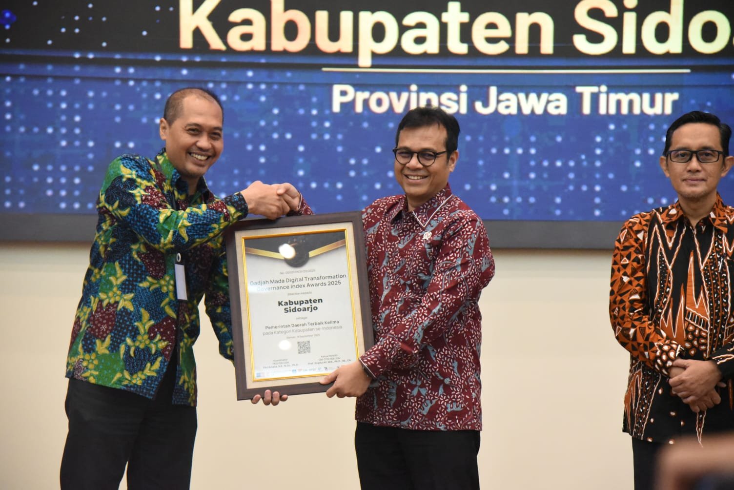 Beritanews9.id || SIDOARJO – Pemkab Sidoarjo berhasil meraih penghargaan Gadjah Mada Digital Transformation Governance Index (GM-DTGI) Award 2025 dari Universitas Gadjah Mada (UGM) Yogyakarta. Pemkab Sidoarjo menjadi salah satu top 10 Kabupaten dengan nilai tertinggi se-Indonesia diurutan kelima. Penghargaan tersebut diterima Sekretaris Dinas Kominfo Sidoarjo Eri Sudewo mewakili Bupati Sidoarjo H. Subandi dari Wakil Menteri Komdigi RI Nezar Patria disela-sela kegiatan Seminar Nasional GM-DTGI Tahun 2025 yang digelar di Auditorium Sukadji Ranuwihardjo UGM, Kamis, (18/9).