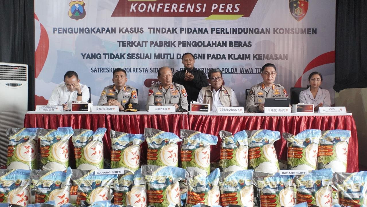 Beritanews9.id || SIDOARJO – Polda Jawa Timur melalui Satgas pangan Polresta Sidoarjo berhasil mengungkap praktik produksi beras premium tidak sesuai standar mutu yang mencantumkan label SNI dan Halal secara tidak sah.