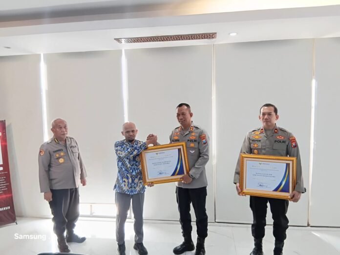Penghargaan diserahkan oleh perwakilan Ombudsman RI Jawa Timur, Triyoga Muhtar Habibi, kepada Harries Budiharto dan Wakapolresta Sidoarjo AKBP Mohammad Zainur Rofik, Selasa (7/4/2026), di Ruang Biro Rena Polda Jawa Timur.