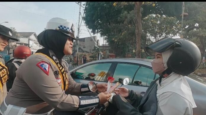 Para Polwan Polres Mojokerto itu turun ke jalan untuk menyapa masyarakat di jalan raya dengan mebagikan bunga dan cokelat kepada pengendara yang tertib dan mematuhi peraturan lalu lintas.