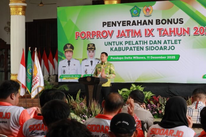 Beritanews9.id || KOMINFO, SIDOARJO — Pemerintah Kabupaten Sidoarjo resmi menyerahkan bonus kepada atlet, pelatih, dan official yang meraih prestasi pada Pekan Olahraga Provinsi (Porprov) Jawa Timur IX Tahun 2025. Penyerahan penghargaan secara simbolis tersebut berlangsung pada 11 Desember 2025 di Pendopo Delta Wibawa sebagai bentuk komitmen pemerintah daerah dalam memperkuat pembinaan olahraga.