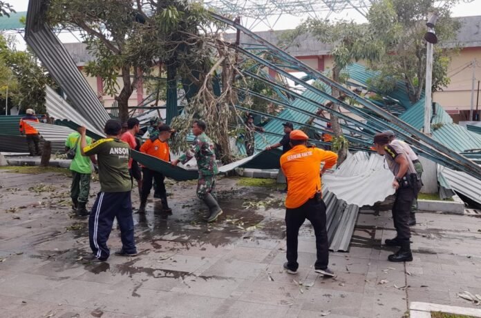 Beritanews 9.id || Blitar – Pasca terjadinya hujan lebat disertai angin kencang yang melanda wilayah Kecamatan Nglegok Kabupaten Blitar, Selasa (14/10/2025). Anggota TNI, Polri, BPBD dan masyarakat melaksanakan kegiatan kerja bakti pembersihan puing-puing reruntuhan atap Stadion Gelora Penataran. Kegiatan ini berlangsung sejak kemarin hingga hari ini di area stadion dan diikuti sekitar 100 orang, Kamis (16/10/2025).