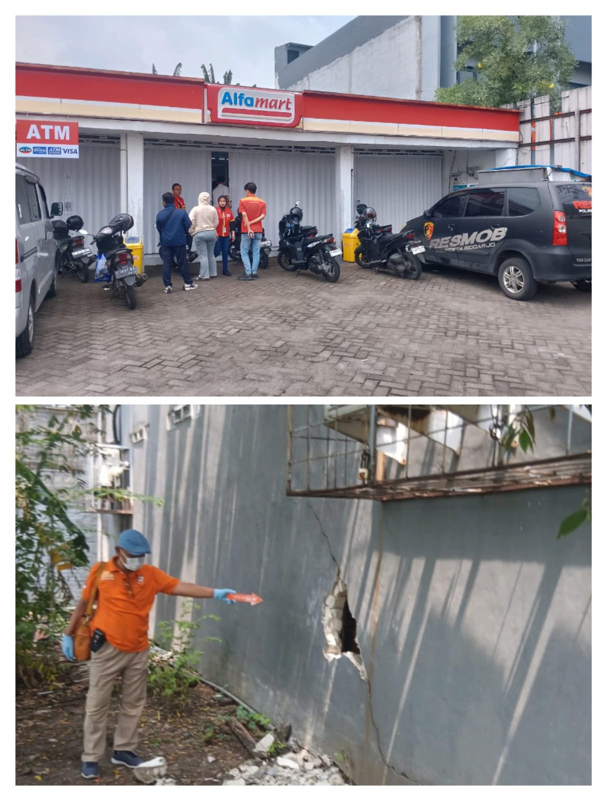 Aksi tersebut diperkirakan terjadi sekitar pukul 02.30 wib disaat lingkungan masih sepi. Pemilik warung disebelah toko yang hendak membuka usahanya pada pagi hari terkejut melihat tembok belakang dalam kondisi berlubang dan segera melaporkan kejadian tersebut ke pihak Polsek Gedangan juga pemilik toko Alfamart.